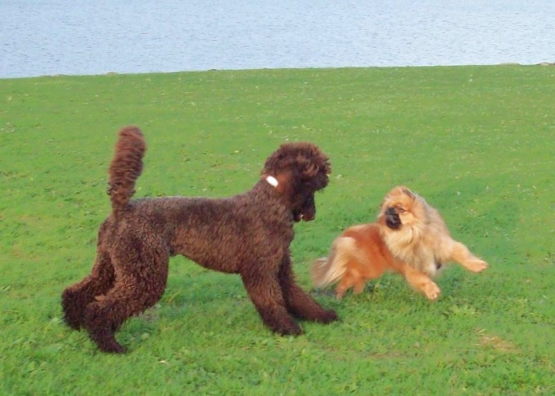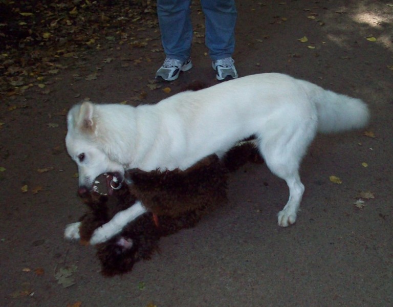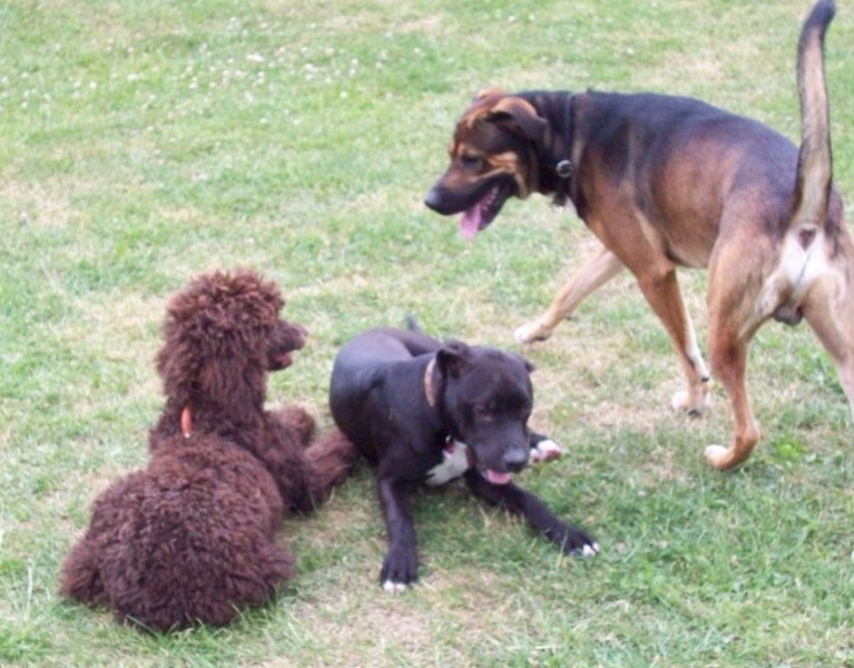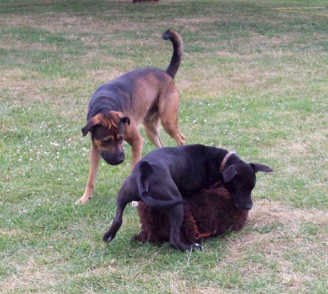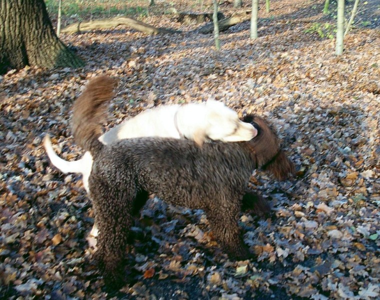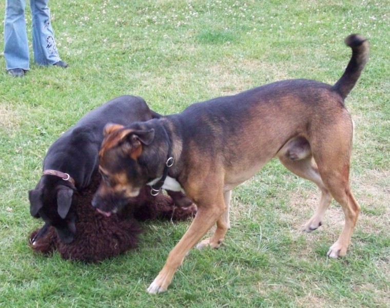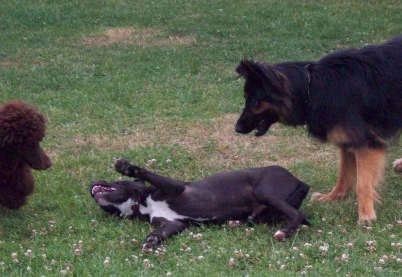 Hier habe ich eine Serie von Fotos, die Paula im Alter von ungefähr 5 Monaten mit zwei anderen Hunden im Spiel zeigt. Sie sind qualitativ nicht immer so besonders, aber sie zeigen, wie ein echtes Hundespiel mit Unterwerfung und allem "Drum und Dran" stattfindet. Paula hat die Spielregeln sehr früh gelernt.